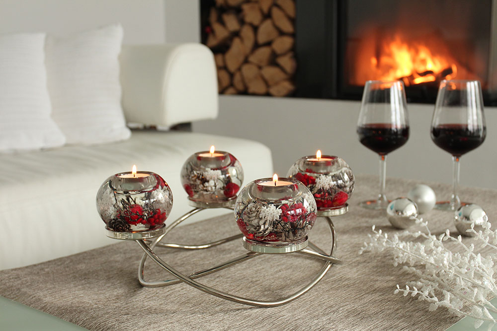 Suport lumanare Dreamlight, model Tealight, Ronda Smart, „Winter Berries”, sticla, transparent, rosu, argintiu, PU 1, H 14 cm, A. 34 cm