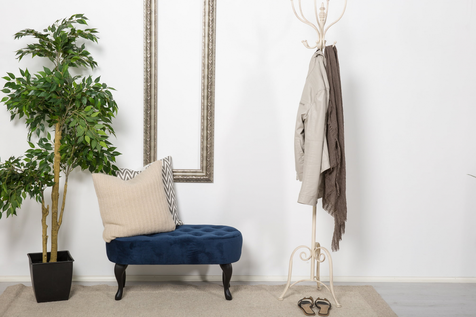 Produs tapitat realizat pe un cadru de lemn masiv de fag si lemn de stejar, umplutura din spuma si acoperit cu stofa.