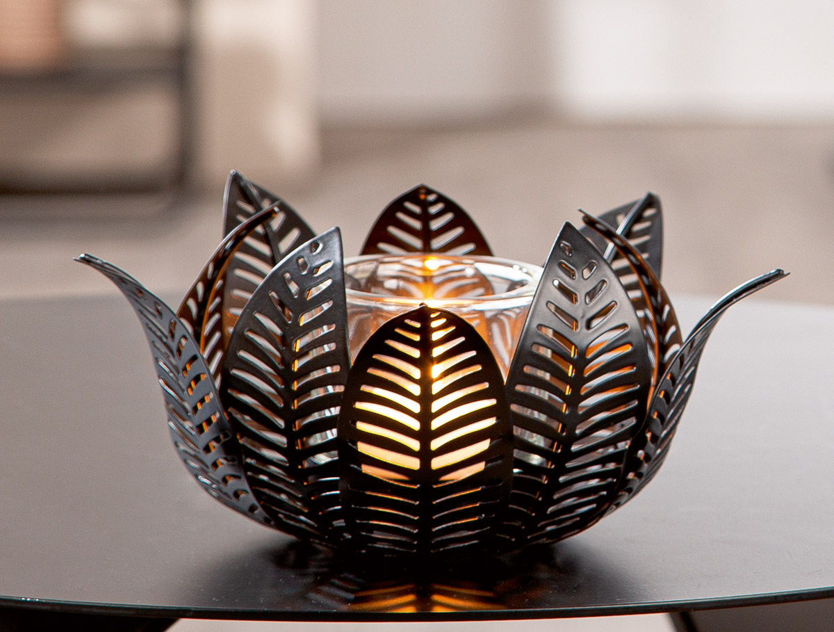 Suport lumanare, Frunză, Hoja, Motiv frunze, Sticlă, Metal, negru, PU 4, L. 18 cm, L. 18 cm, H. 9 cm